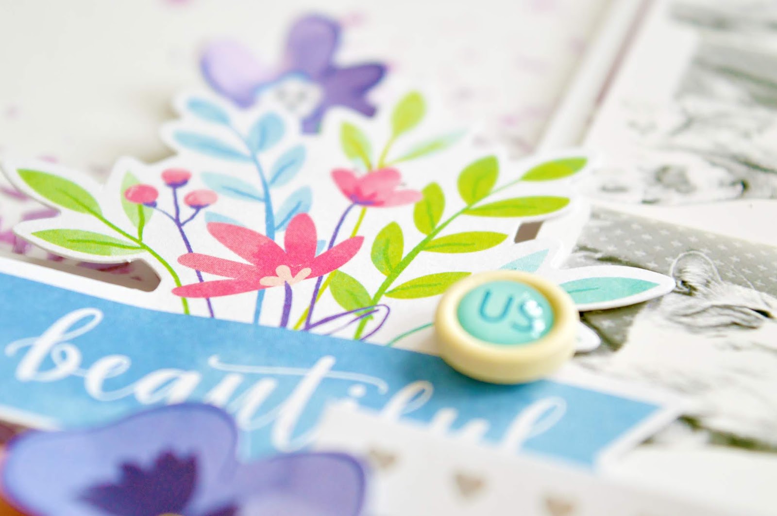 Da qui come al solito son partita a costruire la mia decorazione usando il set di die-cuts floreali della collezione Bloom Street di Paige e aggiungendo qualche stickers, enamel dots e un dolcissimo wood button di Pinkfresh Studio ho chiuso il cerchio.
